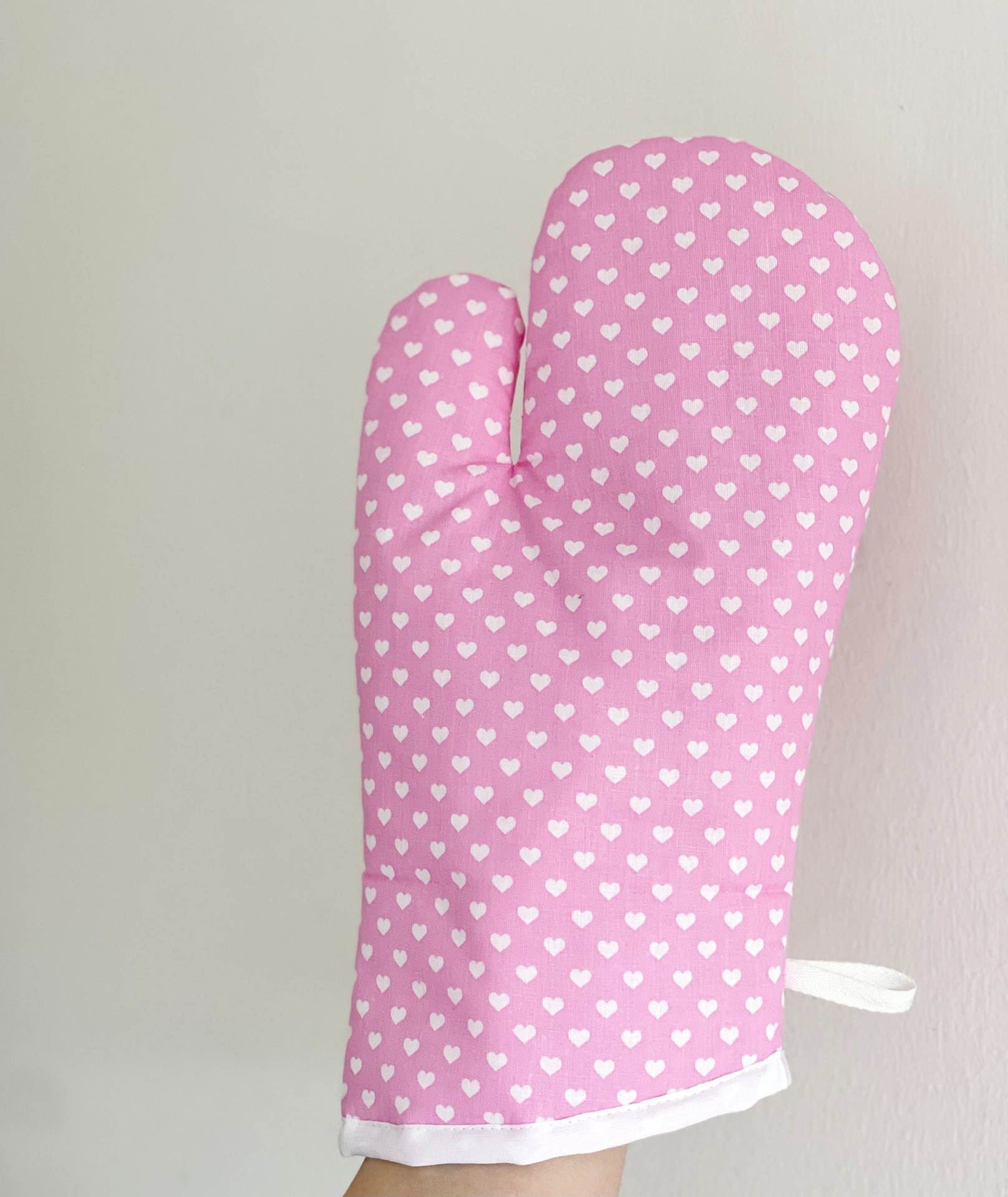 Zástěra a chňapka - růžová s bílými srdíčky - set